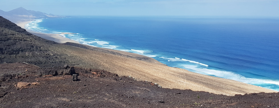 Die nächste Wanderung ging dann sieben Kilometer dem Strand entlang, der Playa de Cofete und Playa de Barlovento. Es gibt auch einen Weg, der weiterführt, über die Hügel, Richtung Risco del Paso. Unterwegs kamen wir an einer felsigen Halbinsel vorbei. Es war ein schönes Bild, die Felseninsel verbunden durch zwei Sandstrände mit dem grossen Strand. Ein gutes Stück weiter wurde der Strand immer schmaler. Die Felsen rückten näher und es lagen interessante Felsbrocken am Strand. Dummerweise hatten wir vorher die Gezeiten nicht angeschaut. Als Frank dies auf seinem Handy nun abcheckte, sahen wir, dass das Wasser noch weiter ansteigen würde. Damit uns der Rückweg nicht abgeschnitten würde, drehten wir um und machten uns auf den Rückweg.