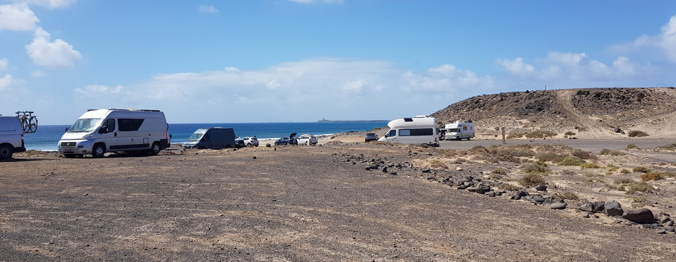 Weiter ging's von Esquinzo nach Piedras Caldas. Wir peilten einen Übernachtungsplatz am Meer an, der an unserem Weg lag. Da wir eine grössere Bungalowanlage umrunden mussten, war es etwas schwierig, den Weg zu finden. Nach mehreren Anläufen klappte es dann. Der Platz war nicht so gross und es stand schon ein spanischer Campingbus dort. Zwei Stühle standen davor und ein Mann hatte es sich dort gemütlich gemacht. Da wie gesagt, der Platz klein war und es auch so aussah, als würden die Bewohner des Campingbusses bei offener Klappe schlafen, fragte ich den Mann, ob es stören würde, wenn wir auch hier übernachten würden. Überhaupt nicht, meinte er, doch wir sollten noch näher zu ihm fahren, damit wir niemanden behindern würden. Jetzt streckte eine Frau den Kopf aus dem Camper. Sie hiess uns willkommen. Im Gespräch erfuhren wir, dass sie türkischstämmige Deutsche ist, jedoch wegen ihres Mannes, welcher Spanier ist, viel Zeit auf Fuerteventura verbringt. Sie haben eine Wohnung hier, machen aber gerne mehrtägige Ausflüge mit dem Camper.