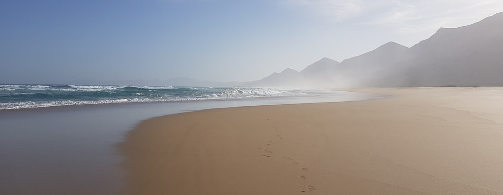 Bevor wir die Insel wieder verliessen, wollten wir noch den Weg von Lajares zur Playa de Esquinzo gehen. Von Lajares ging es durch den Barranco del Jable, ein grosses sandiges Gebiet, dann weiter über eine Anhöhe nach El Cotillo. Die Region um El Cotillo ist sehr beliebt bei Surfern. Wir übernachteten auf einem Parkplatz auf den Klippen. Ich hatte einen schönen Blick auf den Strand und konnte der faszinierenden Brandung und den Surfern zuschauen. Am nächsten Morgen konnte ich eine Crew beobachten, welche Fotoaufnahmen für Strand- und Bademode machte. Es war extrem windig, die roten Fahnen waren aufgehängt und die Brandung donnerte an den Strand. Das arme Model musste sich geniesserisch im Liegestuhl räkeln, während die restliche Mannschaft in langen Hosen und Jacken um sie herumwuselten.