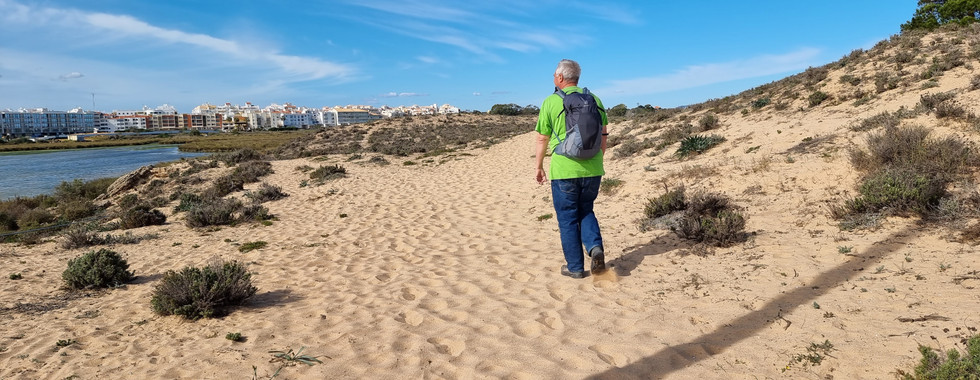 Der lange Strand endete bei der Einmündung des Ribeira de Odiaxere. Wir sahen Lagos auf der anderen Seite. Es wäre so nah, doch man musste sehr weit hochlaufen, um das ganze Gewässer zu umgehen. Als wir durch Alvor hochliefen, ertönte plötzlich sehr laute Musik. Wir dachten, dass es irgendwo eine Musikveranstaltung geben würde. Da bemerkten wir, dass diese extrem laute Musik näher zu uns kam. Wir wurden überholt von einem alten Mann auf einem Roller. Er hatte eine grosse Boom Box an seinen Roller montiert und den Sound voll aufgedreht. An der Reaktion der Einheimischen merkte man, dass er kein Unbekannter war. In Montes de Alvor endete leider unsere Wanderung, früher, als geplant, da ich aus familiären Gründen zurück in die Schweiz fliegen musste.