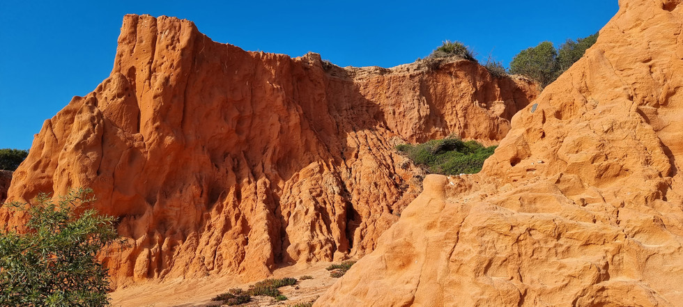 Vom Leuchtturm nach Algar Seco, bei Carvoeiro, verlief der Weg in steilem Gelände. In der Nähe eines Hotels war ein Tischchen mit zwei Stühlen am Rand einer Klippe platziert und lud zum Verweilen ein. Bei Algar Seco konnte man in der Felslandschaft rumklettern. es gab auch einen Gang, an dessen Ende es Öffnungen wie Fenster hatte.