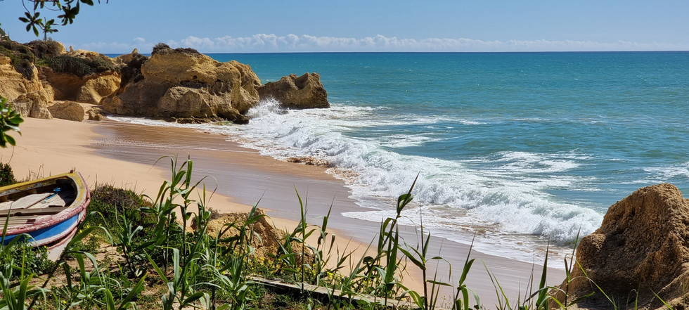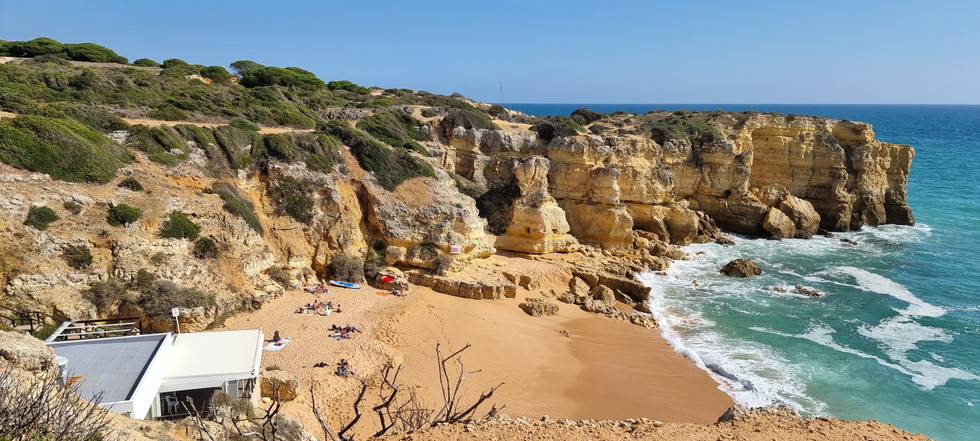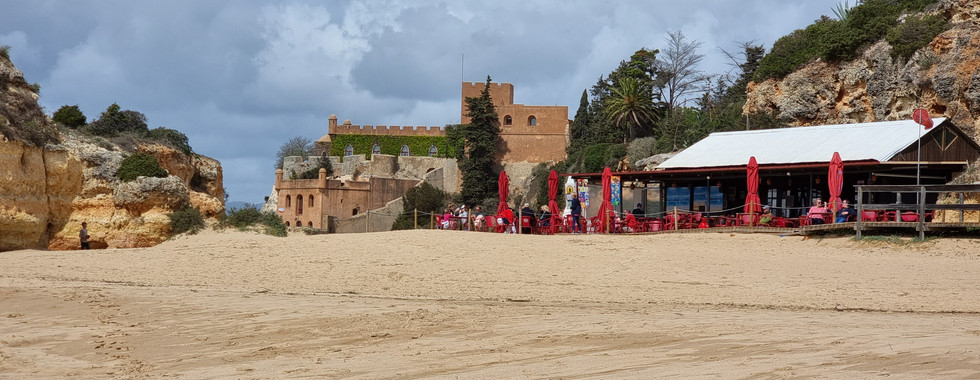 Weiter ging's zum Hafen von Albufeira runter, den wir umrunden mussten. Rund um den Hafen gibt es Hotels, Restaurants, Cafés und Shops mit verschiedenfarbigen Fassaden. Auf dem Weg zur Praia de Sao Rafael hatten wir abwechslungsreiche Kulissen, schöne Felsformationen und wieder ein herziges Strandrestaurant an der Praia de Sao Rafael.