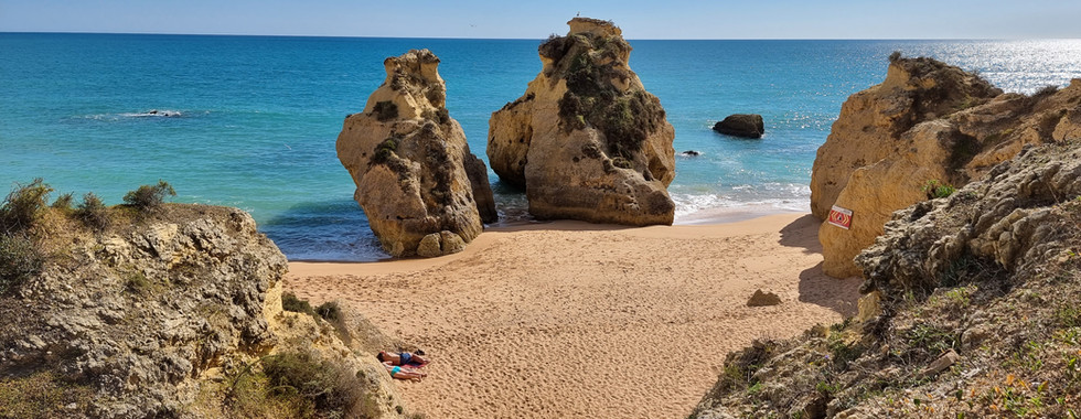 Entlang der Promenade von Pera, bis zum Ende des Strandes und wieder weiter über die Klippen, folgten wir dem interessanten Weg bis Vila Lara. Bei einem Hotel an sehr schöner Lage sahen wir, wie die Anzahl der Strandbesucher, während Corona, festgelegt wurde. Es gab bei jedem Strand eine Ampel, bei der auch die zulässige Personenzahl angegeben wurde. Wieder kamen wir an vielen schönen Buchten vorbei. Auf einer Landzunge leuchtete weiss die Ermida de Nossa Senhora da Rocha, eine kleine Kapelle, ungefähr 30 m über dem Meer.