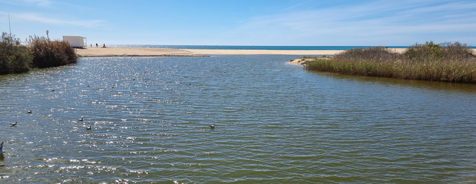 Wir machten uns auf, Richtung Armaçao de Pera, zuerst hinter der Düne durch die weissen Sträucher, wo uns plötzlich eine Herde mit Schafen und Ziegen entgegen kam. Dann kamen wir zu einem Steg, der zum Strand führte, dem wir weiter folgten. Kurz bevor wir den Ort erreicht hatten, versperrte uns der Ribeira de Alcantarilha den Weg. Wir mussten im Hinterland die nächste Brücke suchen.