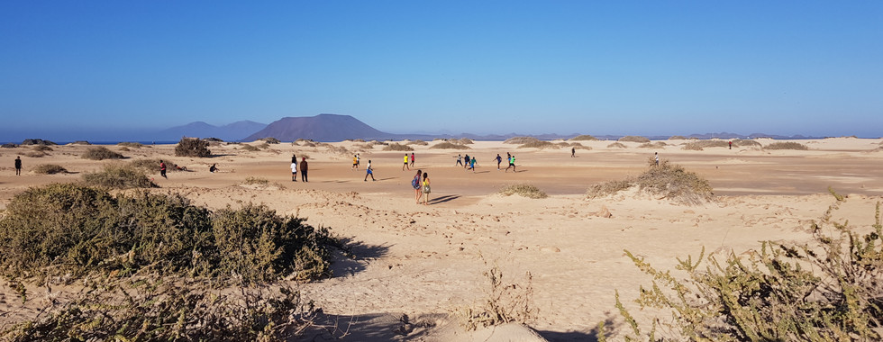 Wir sind zuvor von Corralejo aus, soweit möglich, dem Meer entlang bis zu den schönen Playas Grandes gelaufen, zwei langen, breiten Sandstränden, mit Aussicht auf die kleine Insel Lobos. Dahinter erstreckt sich eine weite Dünenlandschaft, die zum Naturpark von Corralejo gehört. Diese Sandlandschaft hatten wir schon von Lanzarote aus gesehen.