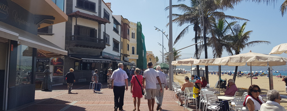 Später sitzen wir gemütlich zusammen. Da Edith und Peter sich schon länger auf Gran Canaria aufhalten, können sie uns Tipps geben. Am nächsten Tag gehen wir zusammen, entlang der schönen Promenade, in die Stadt. Es ist schön und warm. Die Leute spazieren und viele liegen am Strand. In einem Restaurant finden wir einen Tisch, direkt hinter dem Strand. Wir sehen dem Treiben am Strand zu, beobachten die Leute, die vorüber schlendern und geniessen unsere Tapas.